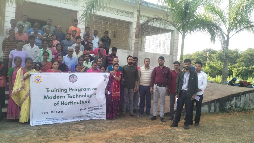 Yawan Kissan Library for Information & Broadcasting Resource Authority (YK LIBRA)a national level organization working for agri-based livelihood promotion has conducted a training program on22nd December 2025 focusingon “Modern Technologies of Horticulture”at Niharnagar Community Hall, Niharnagar GP, SouthTripura. Central Institute of Horticulture (CIH), Dimapur, Nagaland under Ministry of Agriculture and Farmers Welfare, Govt. of India has supported to organize the training. YK-LIBRAand CIH are putting efforts to strengthen the overall farming skills of the farmers byadopting Good Agricultural Practices (GAP), sustainable farming, value addition at local level and exploring alternate markets for better price realization. In the training program, 60 farmers participated fromNiharnagarGPwith the action plan to implement the new learnings in their field. The farmers basically grow Paddy, turmeric, pineapple, orange, banana and seasonal vegetables. This training will help the farmers and the EPFCs for better productivity with better price realization along with achieving the Sustainable Development Goals.