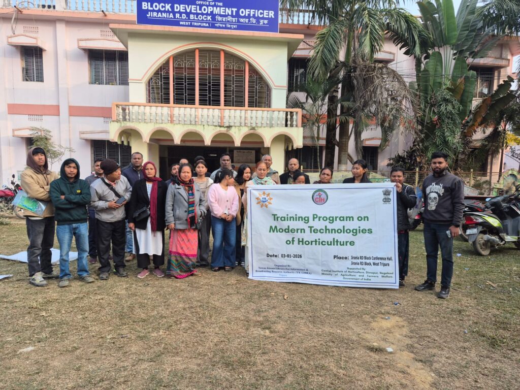 Yawan Kissan Library for Information & Broadcasting Resource Authority (YK LIBRA)a national level organization working for Agri-based livelihood promotion has conducted a training program on03rd January 2026 focusingon “Modern Technologies of Horticulture” at Jirania RD Block Conference Hall, Jirania Block, West Tripura. The initiative was supported by the Central Institute of Horticulture (CIH), Dimapur, Nagaland under Ministry of Agriculture and Farmers Welfare, Govt. of India. YK LIBRAand CIH are putting efforts to strengthen the overall farming skills of the farmers byadopting Good Agricultural Practices (GAP), sustainable farming, value addition at local level and exploring alternate markets for better price realization.In the training program, 50 farmers participated from Mandwi&JiraniaRD Block under West Tripura District with the action plan to implement the new learnings in their field. The farmers basically grow Paddy, Scented Lemon, pineapple, orange, banana and seasonal vegetables. Mandai FPO, Purba Barjala MSSL & Mandai Upajati MSSL is supporting these farmers to aggregate the produce for bulk selling.Mr. Khokon Roy, Retired Deputy Director, Horticulture, Government of Tripura and Mr. Bijan Chowdhury, Retired Deputy Director, Agriculture Department, Government of Tripura, were present as resource persons. Thistraining will help farmers and EPFCs in achieving improved productivity, better price realization and sustainable development goals.